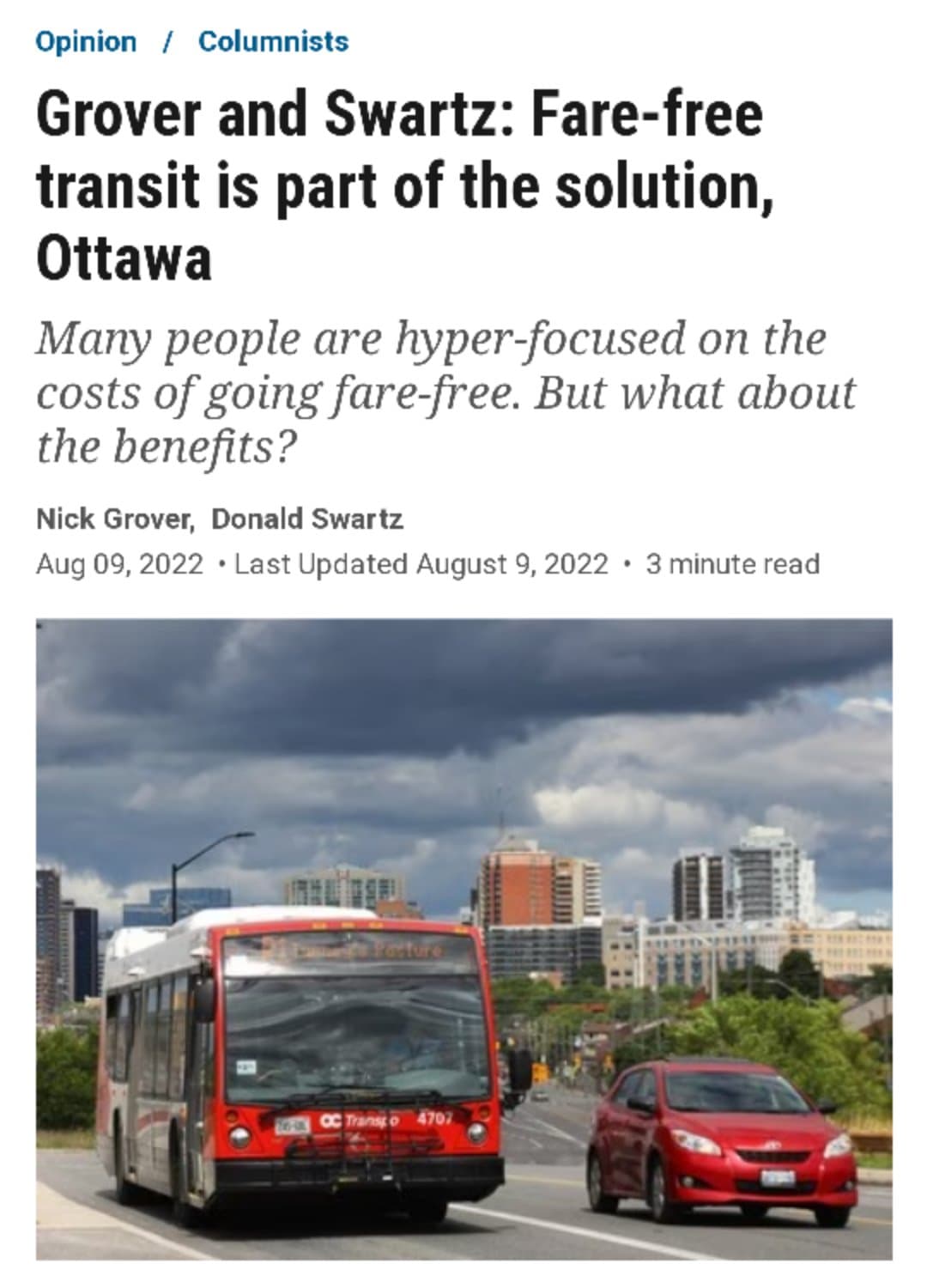 Two of our members published an op-ed in the Ottawa Citizen. Check it out here: https://ottawacitizen.com/opinion/grover-and-swartz-fare-free-transit-is-part-of-the-solution-ottawa